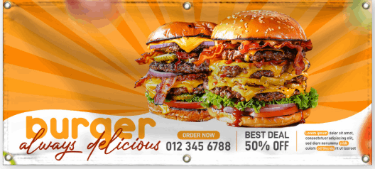 Imprinted Durable Vinyl Banner; 34” x 72” with 10 metal grommets, five (5) along top and five (5) along bottom of banner, full-color printing on white background, camera-ready artwork provided.