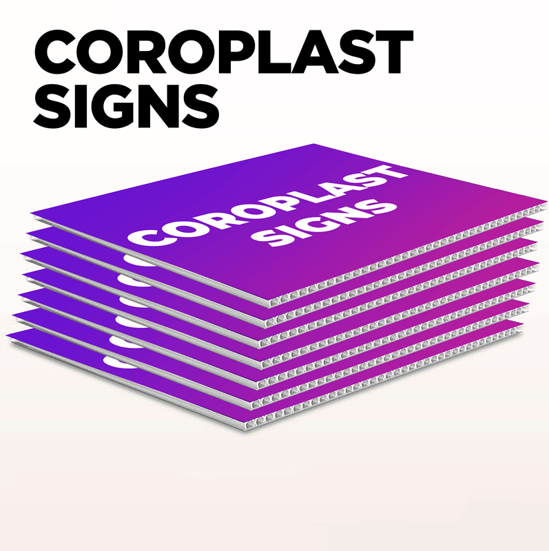 Full-color corrugated plastic yard signs with metal “H” stands: 18” x 24”, printed on one side, camera-ready artwork provided.